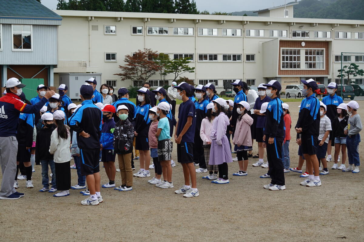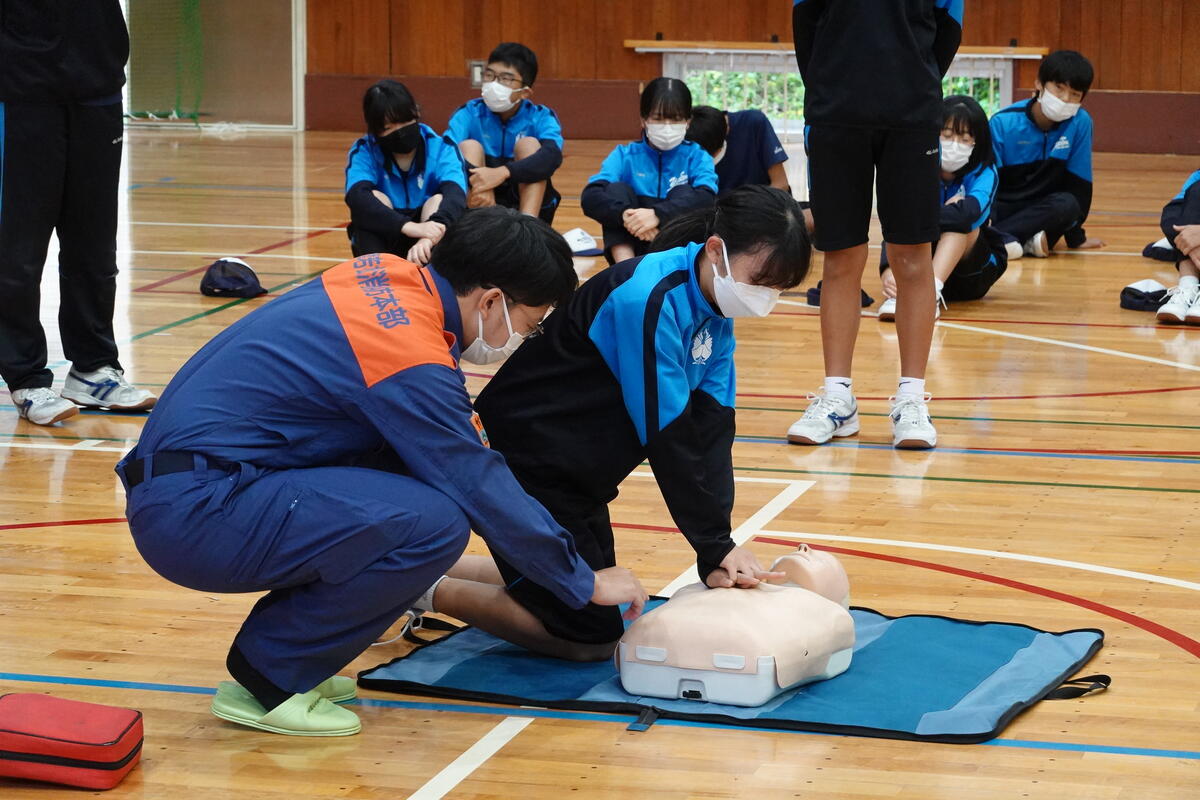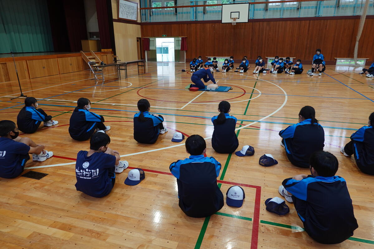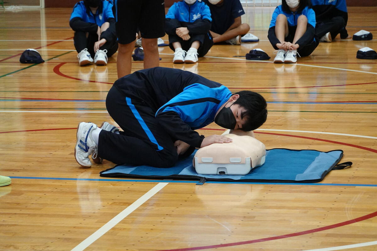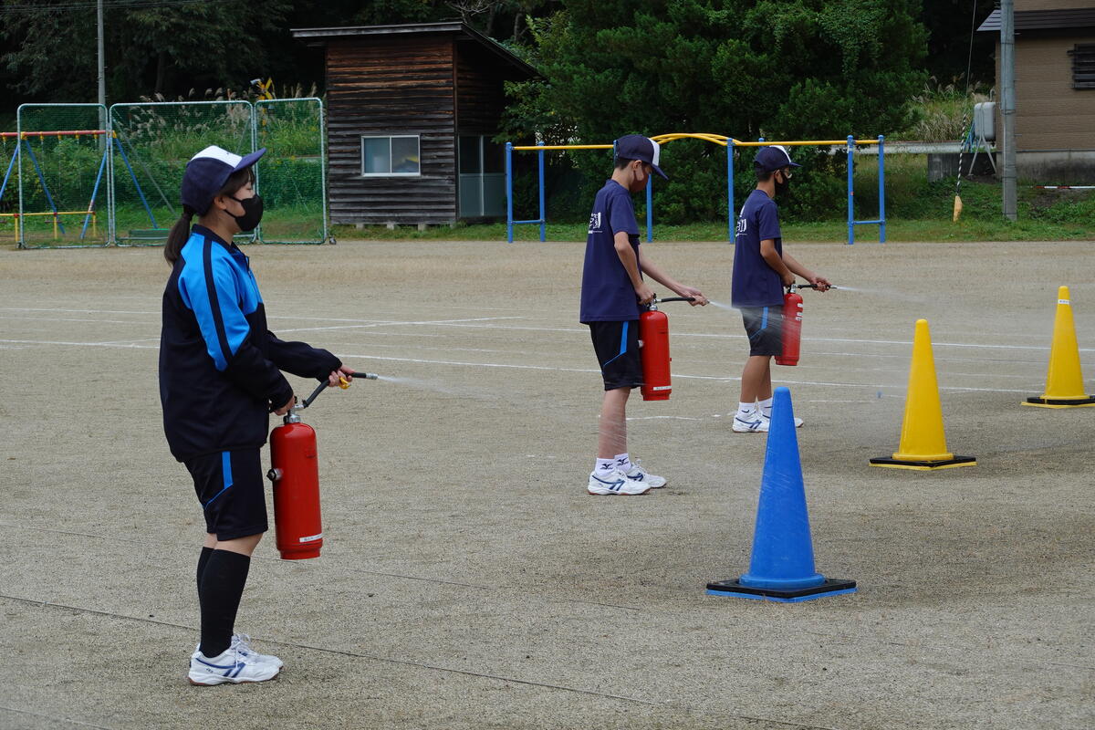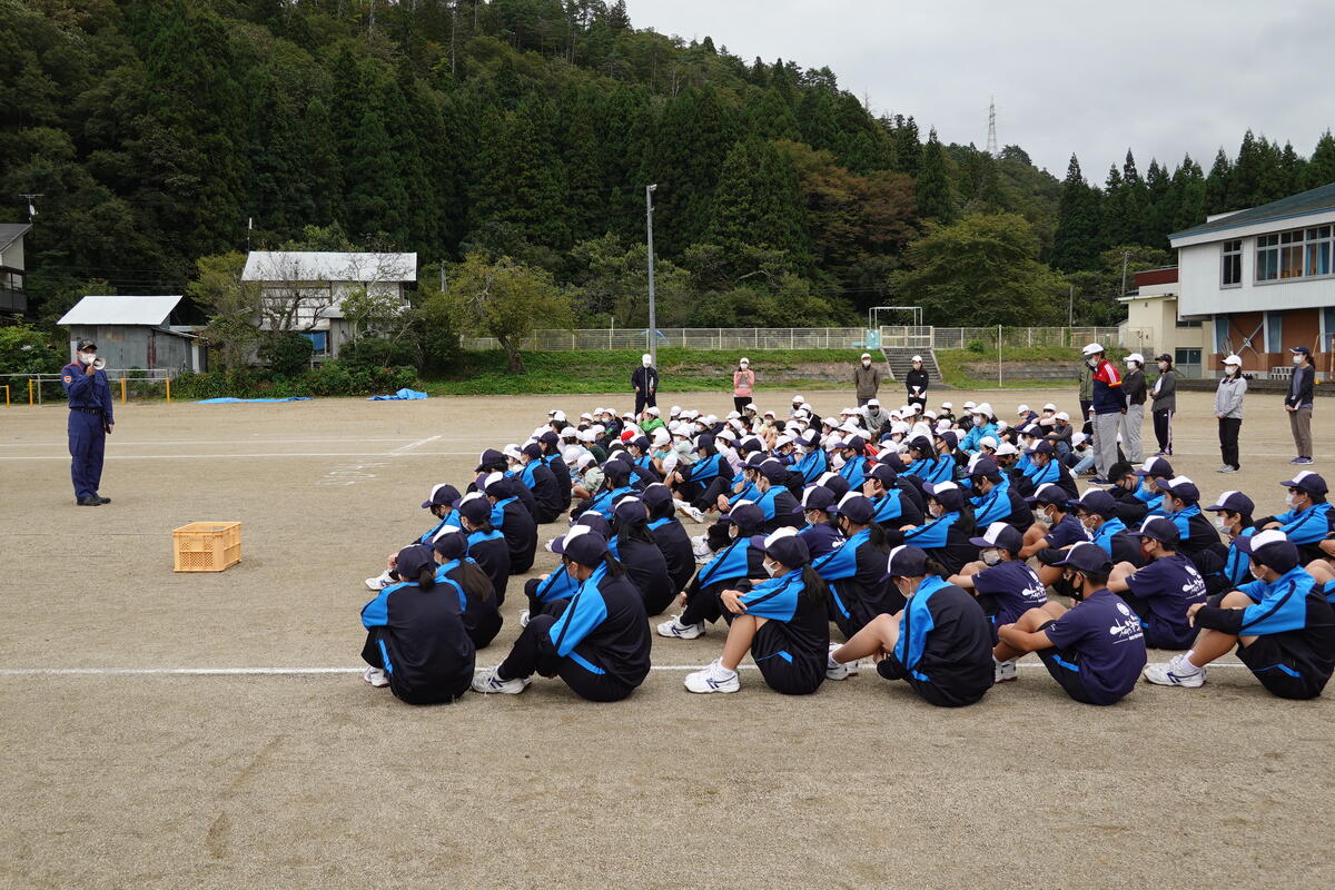 2022年10月5日 19時11分本日、柳津小と合同の避難訓練と救命救急教室を開催しました。避難訓練では、第一避難場所から第二避難場所に移動する際に、中学生が小学生を誘導して一緒に避難しました。また、水消火器を使っての消火訓練も行うことができました。万一の場合の行動を確認する良い機会となりました。避難訓練後に行われた救命救急教室では、心肺蘇生法やAEDの使い方について、消防署の方から実習を交えて教えていただきました。