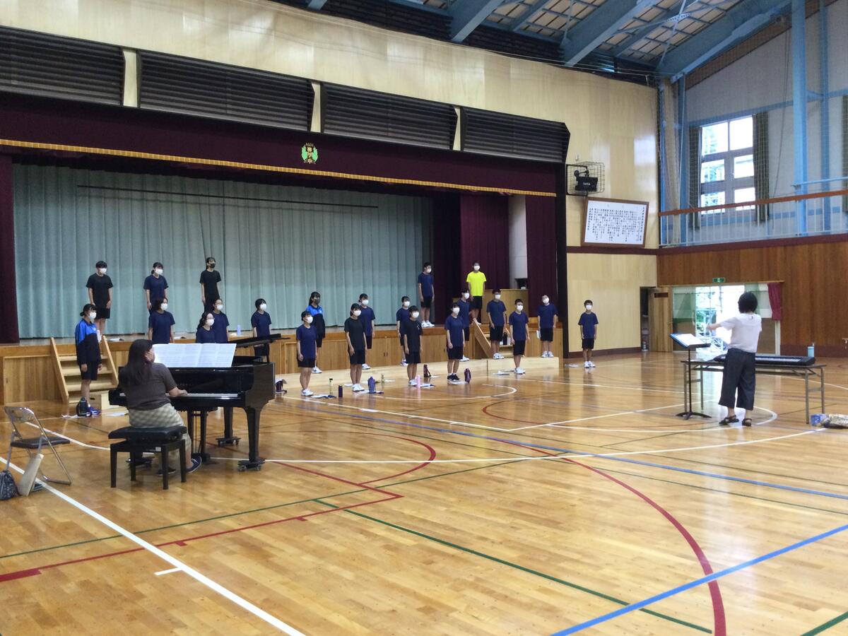 特設合唱部の生徒23名は、明日8月18日(水)に行われます耶麻・両沼小中学校合同音楽祭(第1部)に向けて、夏休み中も練習に励んできました。今日の練習は、昨日に引き続き、体育館で行われました。一人一人が心を込めて歌い、素敵なハーモニーを奏でていました。コロナ禍のため無観客での開催となりますが、昨年行われなかった分、演奏できることに感謝し、自分たちの合唱をしてきてほしいと思います。