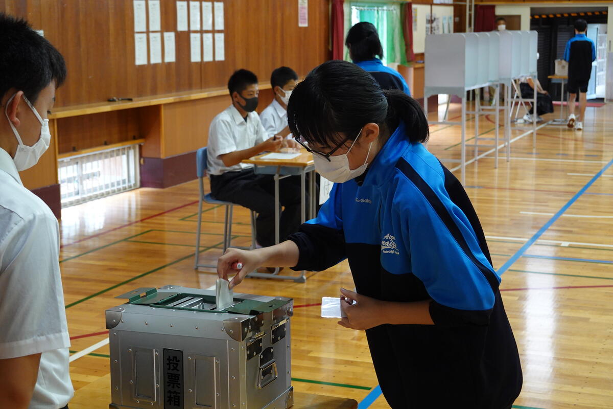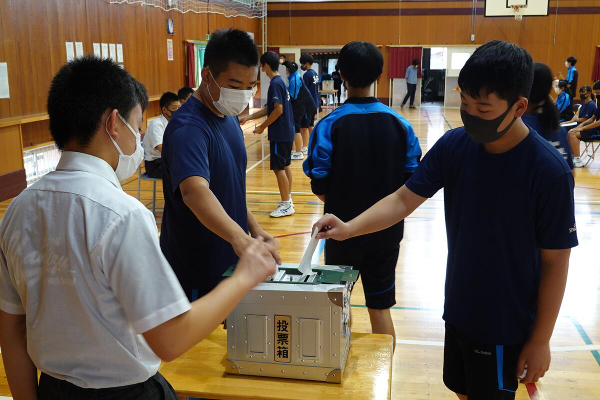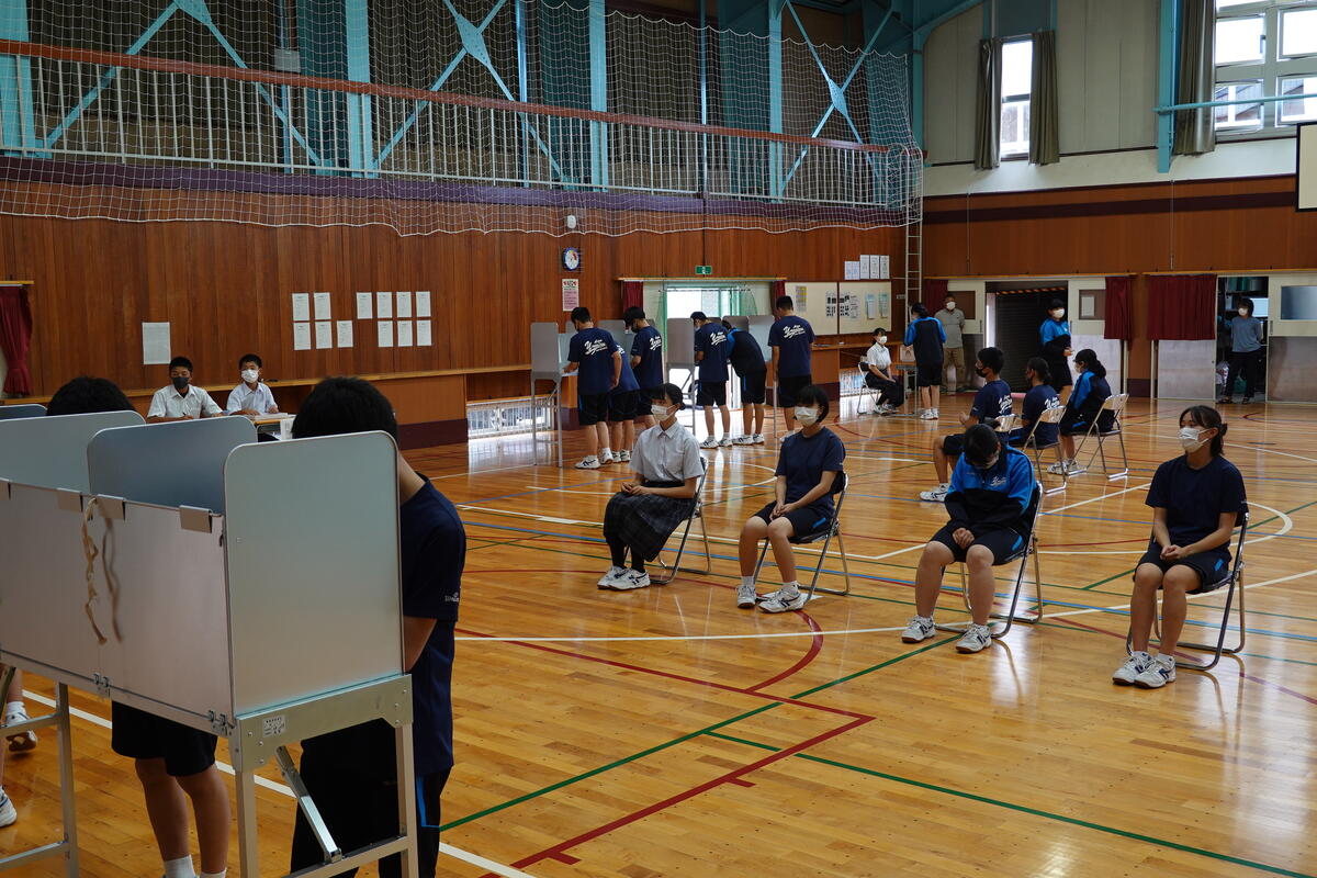 本日、生徒会役員改選に伴い、立会演説会及び投票が本校体育館で行われました。改選となる役職は、会長1名(2年)、副会長2名(2年1名、1年1名)、書記2名(2年1名、1年1名)、会計1名(学年は問わない)でしたが、このうち、1年副会長、会計の役職で選挙が行われました。選挙になった立候補者は、堂々と自分の考えを発表し、当選が確定した立候補者は、今後の生徒会活動についてしっかり述べていました。また、他の生徒たちは真剣な態度で立候補者の話を聞いていました。演説会及び投票では、選挙管理委員長の山本蒼太くんを中心に選挙管理委員が一生懸命準備、運営をしてくれたおかげで、厳正な選挙を行うことができました。