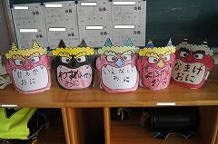 2月を迎えました。校内の掲示類も月替えです。教室には、節分に向けて追い出したい鬼を書いたお面が準備されていました。図書室前の選書コーナーも節分モードです。