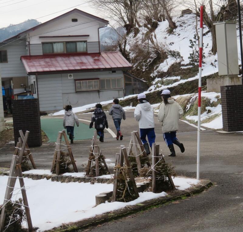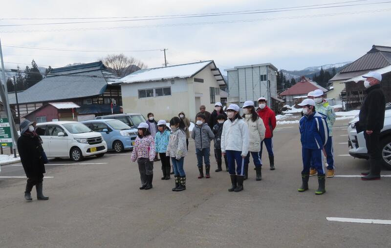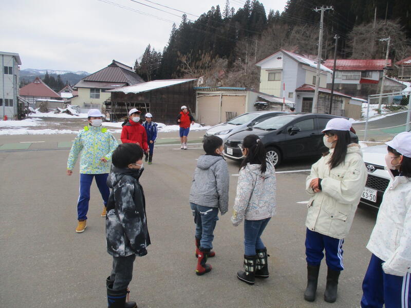 最後は、玄関前で冬場の避難方法について話をしました。(冬の避難場所と避難経路、防寒着の着用と準備、避難中の転倒注意について)