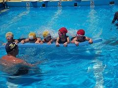 大きなビート板を使っての練習では、全員がビート板につかまり、一斉にキック(バタ足)