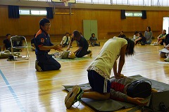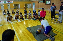 5・6年生も大人の中に混じって、胸骨圧迫による心肺蘇生の仕方やAEDの使用法等を真剣に学びました。