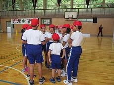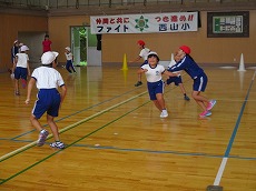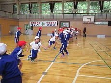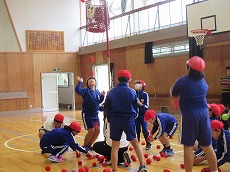 学校では、体育館でミニ運動会が行われ、「紅白玉入れ」「くるくるタイフーン」「オオカミとニワトリ」「森のゴリラ」などをして、元気いっぱい体を動かしました。