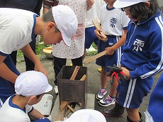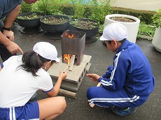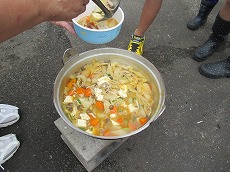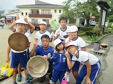 十分に体を動かした後は、いも煮作りです。縦割り班に分かれ、自分たちで苦労して火をつけ、そして自分たちで考えた材料を入れて、自分たちだけのオリジナルいも煮を作りました。自分たちで作ったいも煮だけあって、最後にはどの班の鍋も空っぽになりました。