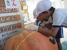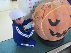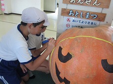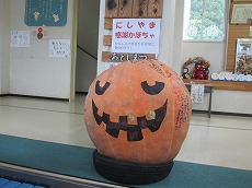 全校児童が玄関に飾られているジャンボかぼちゃに感謝の気持ちを書き表し、「にしやま 感謝かぼちゃ」が完成しました。ご来校の際はぜひご覧ください。