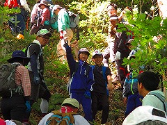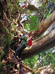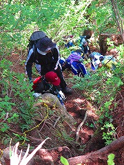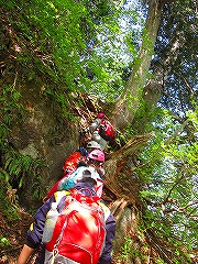 はしご・ロープ、大木の根っこ、岩等を手がかりに、少しずつけもの道のような登山道を上っていった先には、