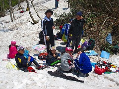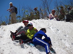 西山っ子は雪を見ると、すぐに遊びが始まります。頂上に積もった雪で、昼食後のそり滑りが始まりました。頂上までの疲れも一気に吹っ飛んだようです。