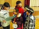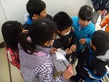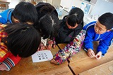 (宝の隠し場所の暗号を6年生と一緒に解く下級生)