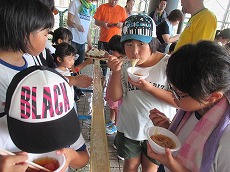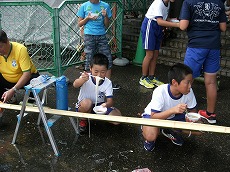 PTA奉仕作業終了後、「親子のつどい」が行われました。親子のつどいの内容は「マラソンティボール」と恒例の「西山流しそうめん」です。流しそうめんは本物の竹を加工し、そうめんが流れるように自作した本格的なものです。今年で3年目になりますが、毎年、バージョンアップされているような気がします。今年も親子で楽しく流しそうめんを食べることができました。