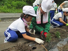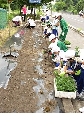 2016年6月27日 08時00分6月22日(水)、「ロードフラワー大作戦」のボランティア作業を西山小中学校の児童と生徒が一緒に行いました。作業でははじめに毎年ご協力を頂いている鹿野さんからお話をいただき、その後、中学生が小学生に花の苗の植え方を教え、一緒に作業をしました。