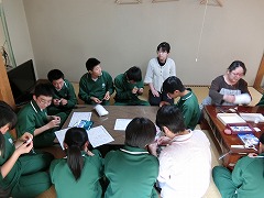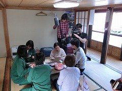 午前中は、校長先生への、ひしストラップ開発の経緯に関するインタビューと、授業風景の撮影が行われ、午後は、会場を老沢温泉旅館に移し、地域の方と中学生がいっしょにひしストラップをつくる様子を取材しました。