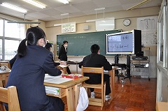 こちらは、3年生の数学の授業です。ICT機器を使い、学習した公式を利用し、暗算で素早く、問題を解く練習が行われています。