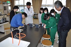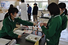 こちらは、2年生の理科の授業です。鉄と硫黄を化合させる実験です。保護者の方々にも実験に参加していただきました。実験後の理科室の臭いはご想像の通りです。