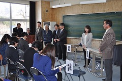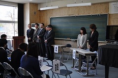 PTA総会での新(右)旧(左)役員の方々のご挨拶の様子です。