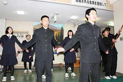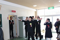 見送りは校舎内で行われ、玄関では在校生から卒業生へのエールが贈られました。