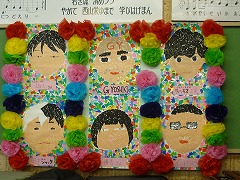上の写真左は「美術班」の作成した、ちぎり絵による3年生4人と、担任、学年主任の先生の似顔絵です。写真右はクイズの様子です。