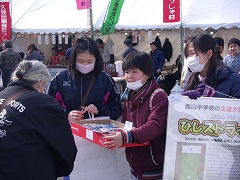 当初はおとなしくお客さんが買ってくれるのを待っていた生徒たちですが、「これ、持って行って販売してきていいですか!?」と、搬入時に持って行った箱のふたにストラップを入れ、屋外に販売に出て行ってしまいました。・・・しばらくして、付き添っていた教員が「もうすぐ無くなりそうなんです。補給します。」と言ってもどってきました。「本当にそんなに売れてるの?」と確かめるべく、様子を見に行くと、次々と会場のお客さんに声をかけるたくましい生徒の姿が!