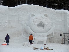写真右は、メイン会場の大雪像。こちらは中学生ではなく、町の大人の方々の手によるもの。建設関係のお仕事に携わる方々も参画しており、「さすがプロの技」という感じです。
