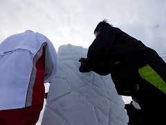 例年に比べ、雪質は柔らかく、崩れやすいとのことですが、小さなショベルなどではなかなか削るのが難しい固さです。スコップやのこぎりなど、削る場所に応じて様々な道具を使い分けて彫刻していきます。