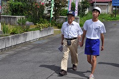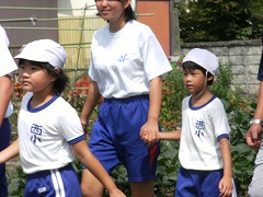 子どもたち・地域の方の手を引いて避難誘導する西中生。