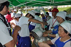 柳津町赤十字奉仕団の方々の指導のもと「ハイゼックス袋」でご飯を炊きます。