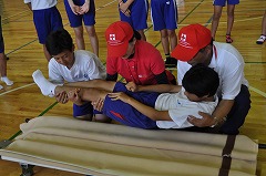 赤十字救急法指導員の方の指導のもと、三角巾を使った応急手当の方法や、患者の搬送方法を学びました。