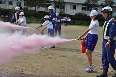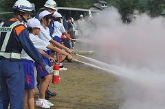 実際に燃える火を的に、本物の消化器で消火する貴重な体験を行いました。