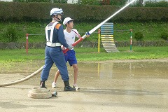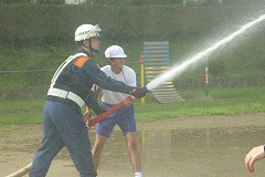 放水訓練では、消火栓の水圧を実感しました。