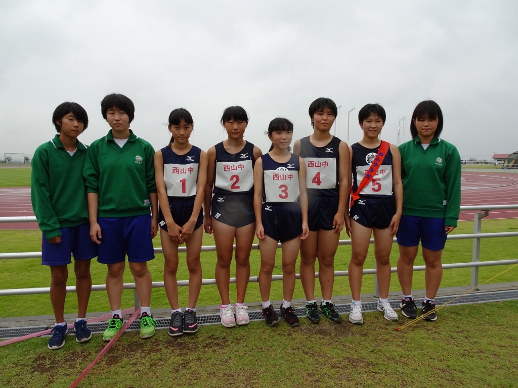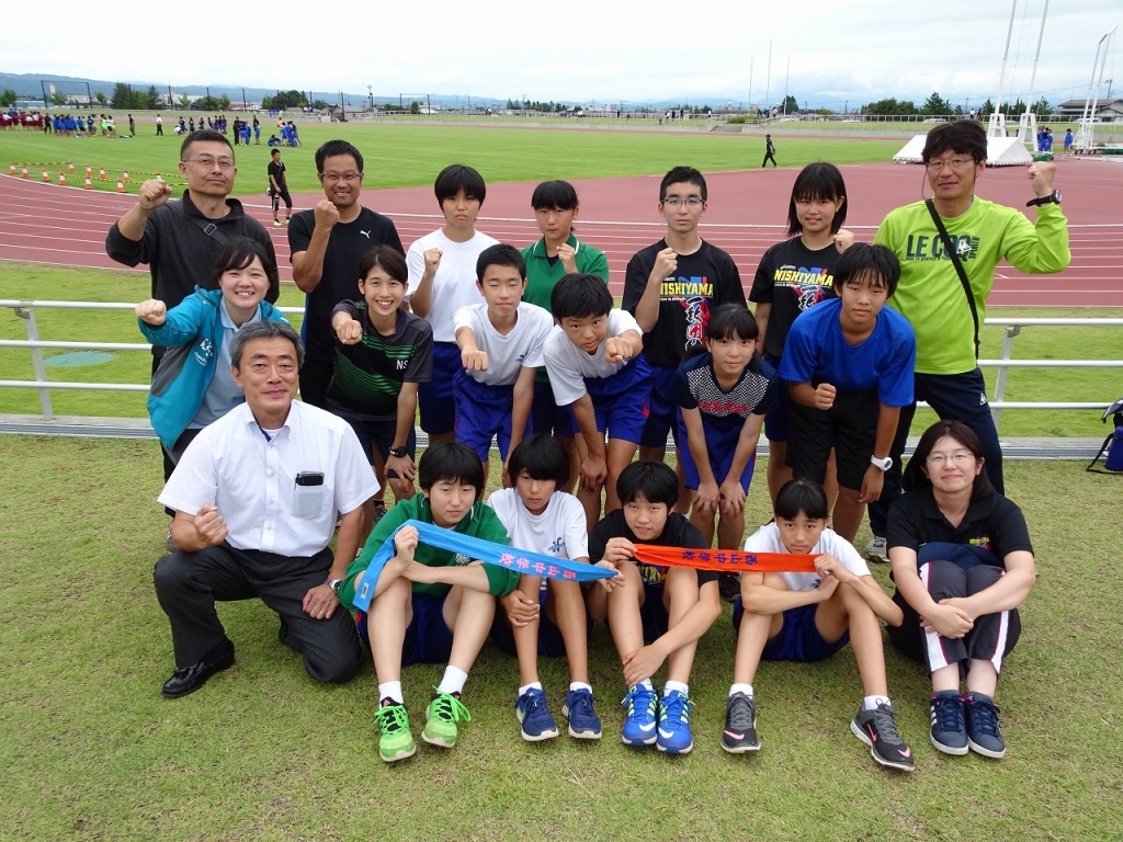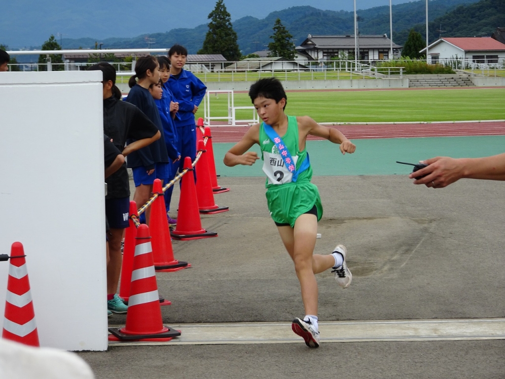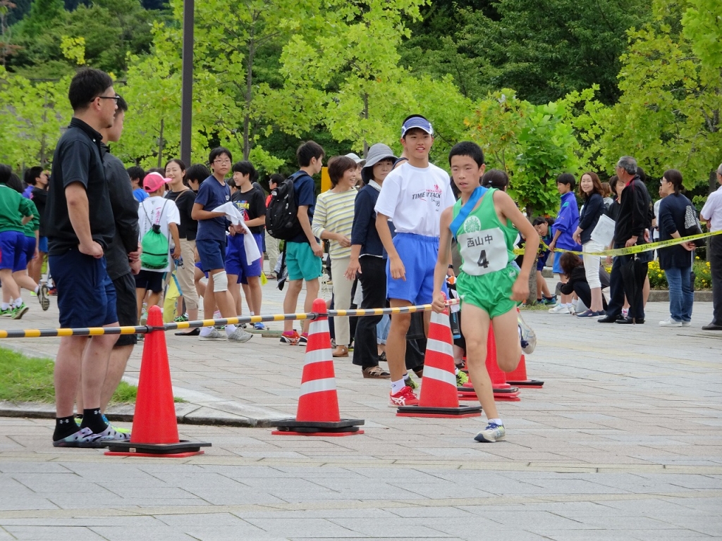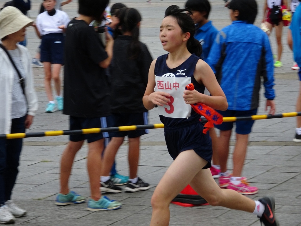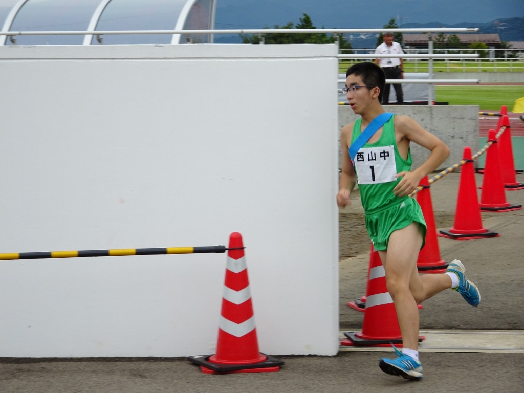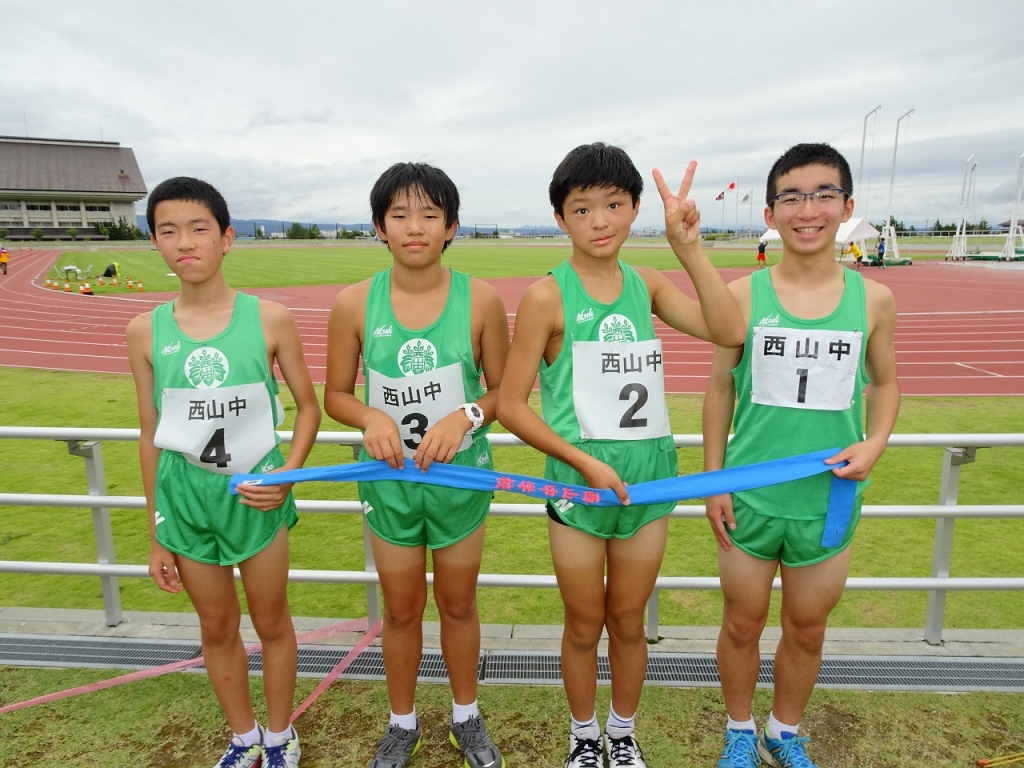 全校生12名の本校より人数が多い学校が大多数の中で、生徒は全力を尽くして大会でベストタイムを出すという、素晴らしい結果を残してくれました。写真を見返すと、生徒の膝~太もも辺りの日焼けの跡がお分かりいただけます。夏休みの暑い中、いかに練習したかが分かる勲章だと思います。今大会で西山中学校としての襷は最後になりましたが、記録と記憶に残る駅伝大会になりました。遠路大会会場までおいでいただいた保護者の方々をはじめ、ロード練習の際に応援いただいた西山地区の方々にも、この場をお借りして御礼申し上げます。