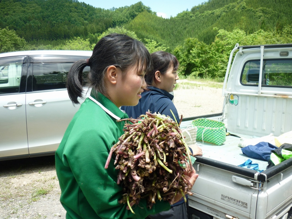 2017年6月28日 11時30分先日行われた「ふき採り」の様子です。本校では山菜の「ふき」を採って山菜加工場に買い取っていただき、その売り上げを部活動のバドミントン部で使うシャトル代に充当しています。