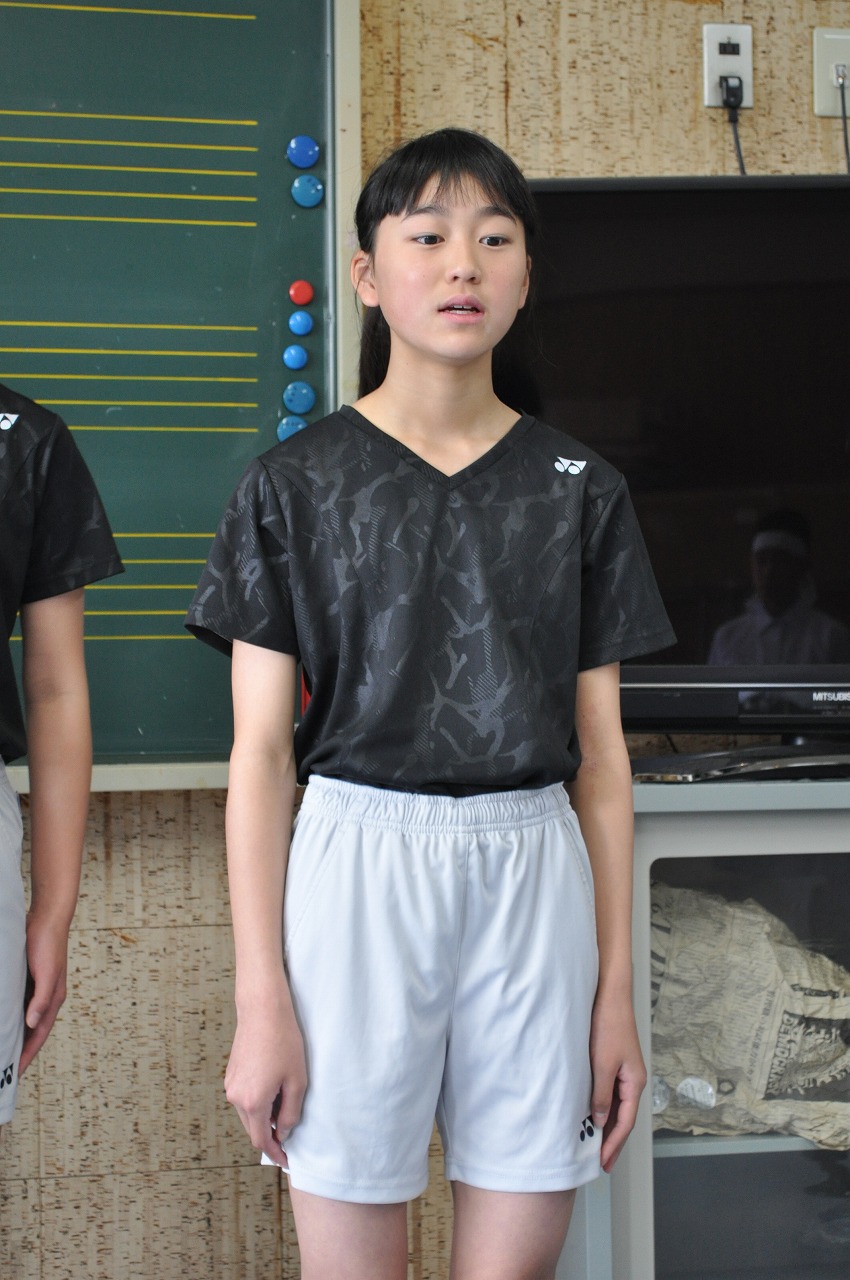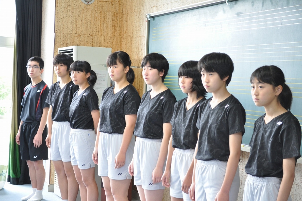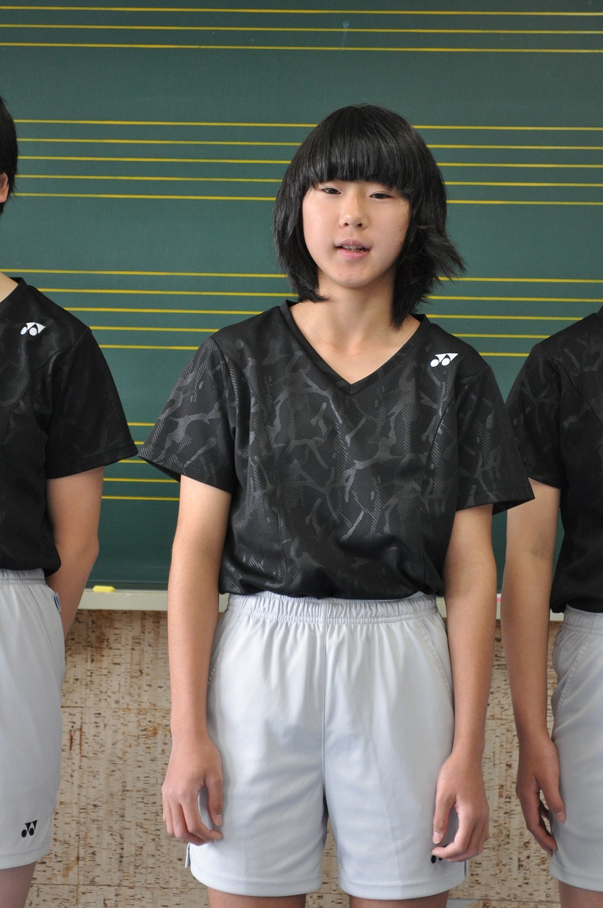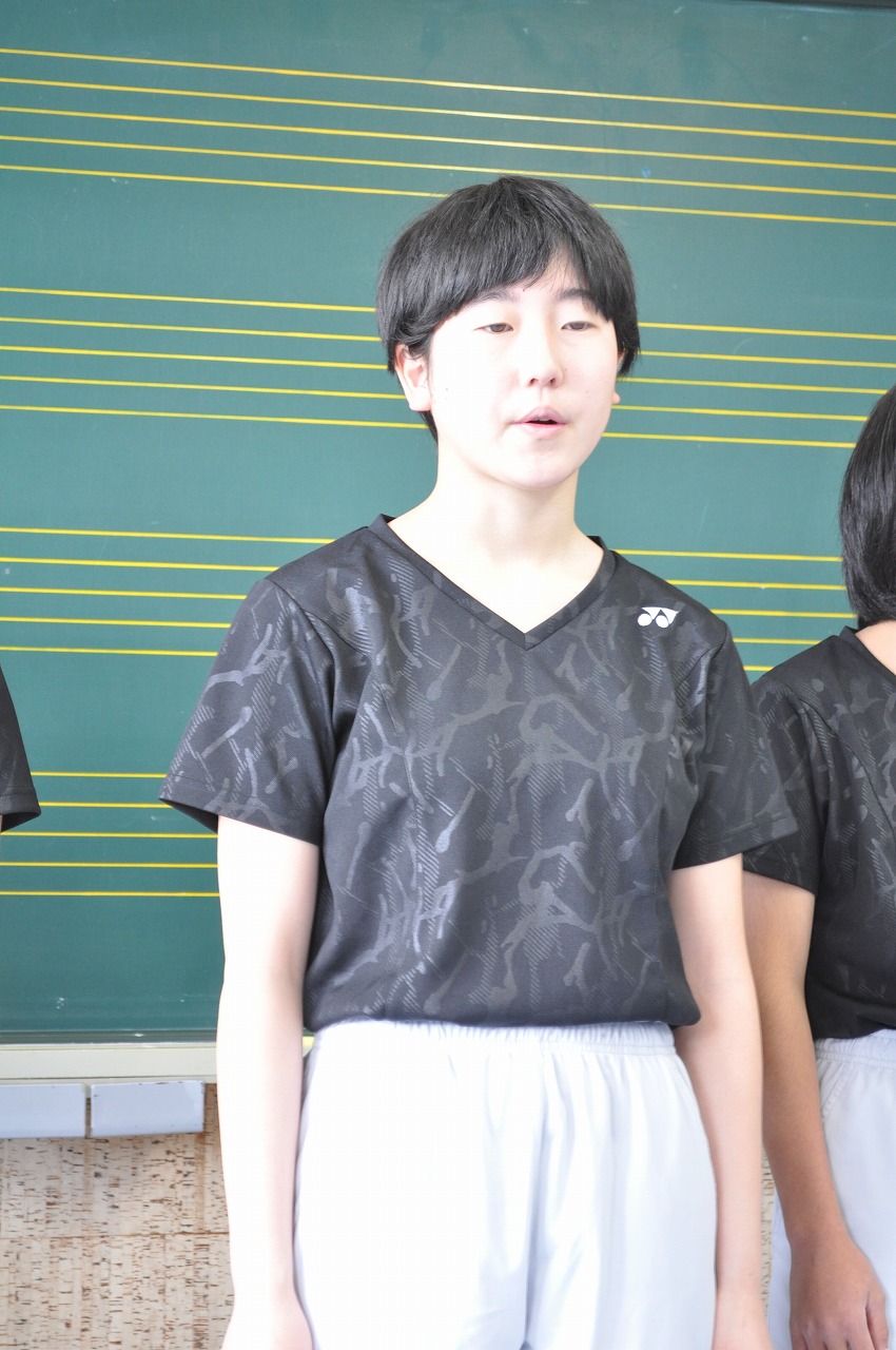 明日の全会津中体連バドミントン大会へ向けて、選手壮行会を行いました。本校は女子団体、女子ダブルスに2ペア、男子シングルスに1人が出場します。壮行会では選手が1人ずつ明日の大会へ向けた抱負を述べ、決意を新たにしました。