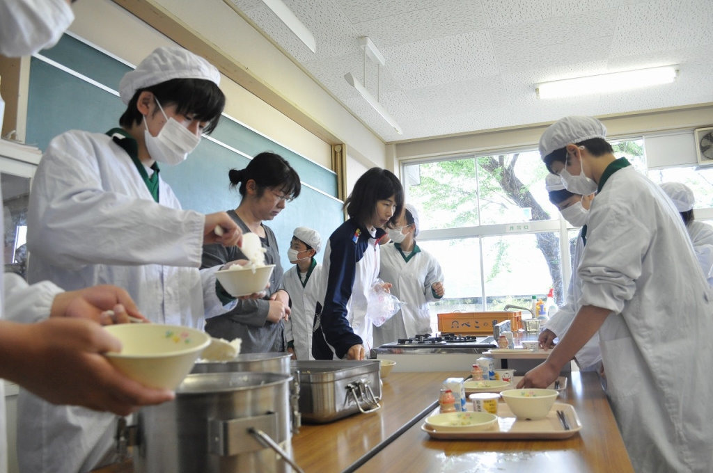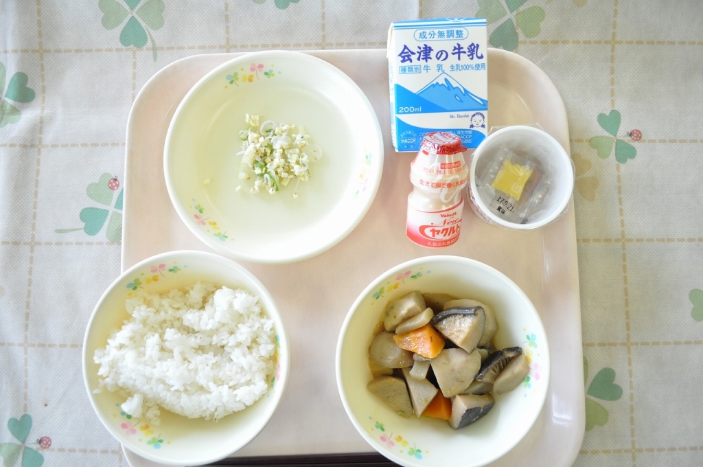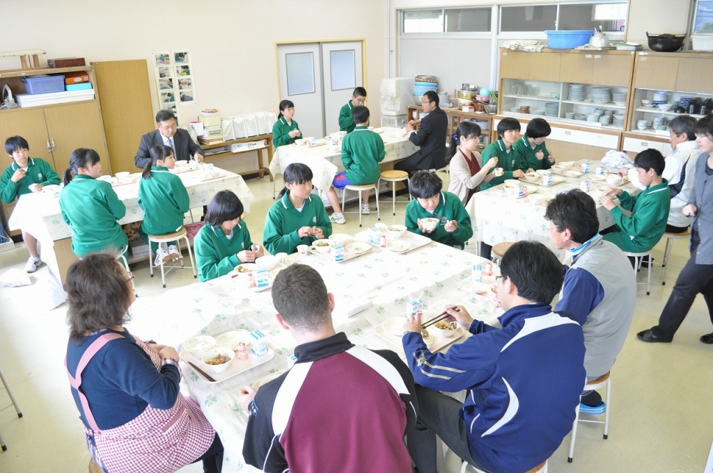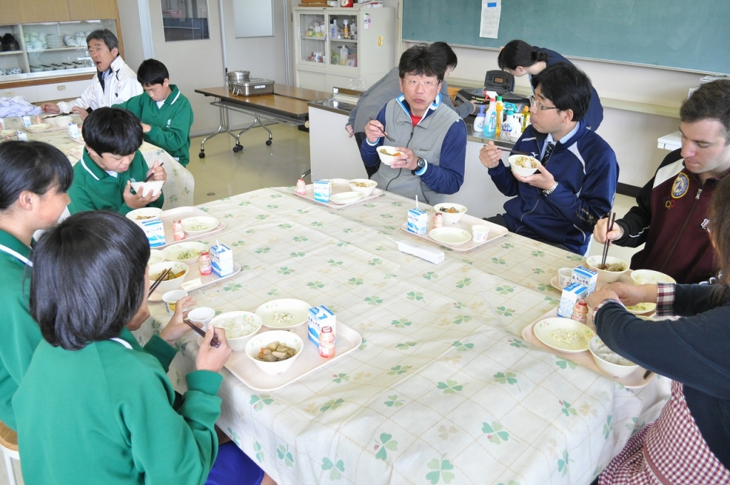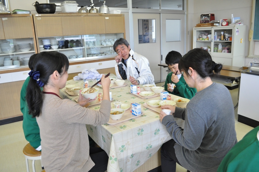 全校生12名ですが、普段は学年毎の教室に分かれて給食を食べています。月に1度程度「全校給食の日」を設定し、家庭科室に全校生と職員が集まって一緒に食べます。この日のメニューは「ご飯・筑前煮・じゃこネギチーズ納豆・ヤクルト・牛乳」でした。