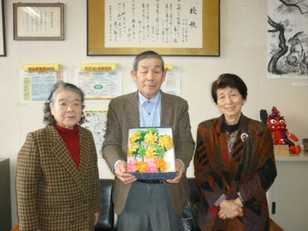 12月25日お忙しい中、柳津町老人クラブより3名の方に来校して頂き、岩佐会長様から卒業式の胸章用花(生徒5名と教師2名分)を贈呈して頂きました。鮮やかな黄色の花で、卒業式の生徒を一段と輝かせてくれるすばらしいものです。本当にありがとうございました。当日、大切に使わせて頂きたいと思います。