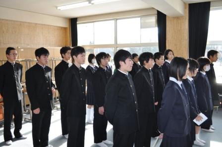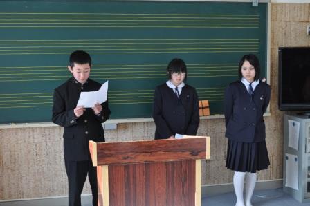 髙橋校長先生から、「短い3学期です。一日一日を大切にして、たとえ小さな一歩でもその日に前進したことを振り返り、自覚することが大切です。・・・一つでも多く実践しましょう。」の式辞がありました。また、各学年の代表生徒から、3学期の抱負の発表がありました。