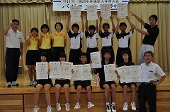両沼中体連新人総合大会バドミントン大会が、25日、坂下中学校体育館で開催され、男子団体が優勝、男子シングルスで第2位、ダブルスで2位、女子ダブルスで第3位に入るなど、すばらしい成績を収めることができました。男子団体はこれで3連覇!西山の伝統を見事引き継ぎました。特に1年生は、シャトルに当てることさえ難しかった春に比べ、堂々とした態度で試合に臨み、勝利に貢献しました。頼もしさも増し、弱々しい1年生から大きく脱皮しました。
