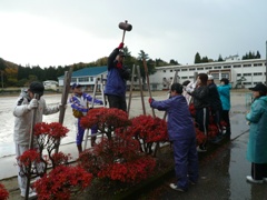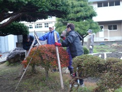 11月10日(土)早朝より、PTA生活委員並びに協力地区の方々に集まっていただき校舎前と中庭の植木の雪囲い作業を行いました。あいにく小雨の中での作業となりましたが、皆さんの手慣れた作業と分担により短時間のうちに終了できました。これで本校の樹木たちも安心して冬を迎えられることでしょう。